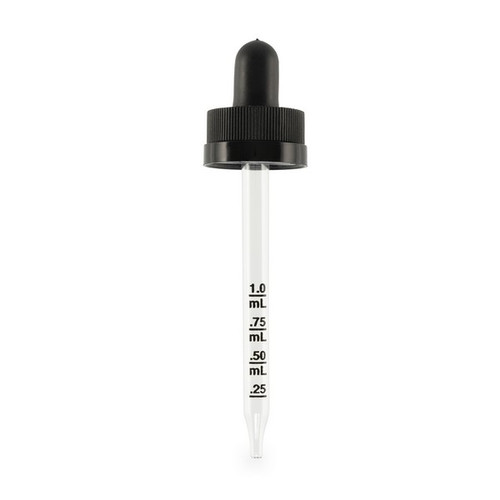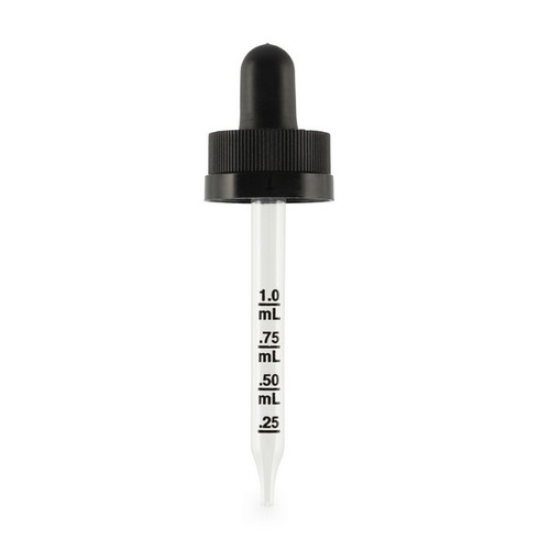 Dispensing is made easy with these graduated PP plastic child-resistant capable dropper caps. Dropper caps requires two separate motions to open, push down and twist. This product has been manufactured to be child-resistant capable.* Pair with compatible bottles to create child-resistant capable packaging that keeps children away from harmful products. Ideal for CBD, cannabis and pharmaceutical products that require precise measurement and dosage. Glass pipette is graduated up to 1 ml in 0.25 ml increments. Output = 0.8 ml. The ribbed collar of the black dropper cap is made of durable PP plastic with a monprene bulb. Clear Type III glass pipette features black calibration screen ink graduations.
