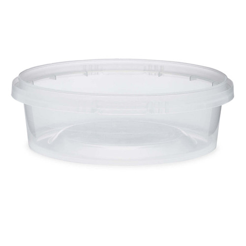 Our 8 oz. Clear Round plastic snap-lock (PP) containers with a tamper-evident security system come complete with a lid and are easy to open and use. The containers are microwave and dishwasher safe. Perfect for everything from dips, grated cheese, and cottage cheese to powder detergents, adhesive and glues. They’re hot-fillable, reusable and 100% recyclable. Max Fill Temperature: 179.6F (82C); Max Freezing Temperature: -9.4F (-23C). IML and Dry Offset decoration is available. Suggested label panel for lid: 3.375in.