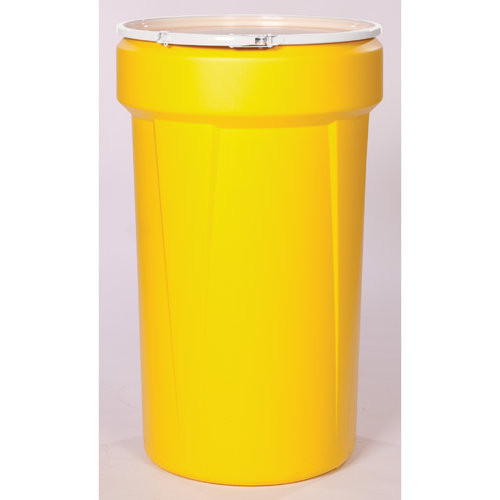The Eagle 55 Gallon Lab Pack / Open Head Drum, constructed of yellow blow-molded high-density polyethylene (HDPE) with UV inhibitors, is durable and lightweight, weather and chemical resistant, and has a white lid with a metal lever-lock band closure. Ideal for safe storage, handling and transportation of hazardous materials, spill containment and cleanup of hazardous materials, original shipping container, bio waste disposal and incineration.