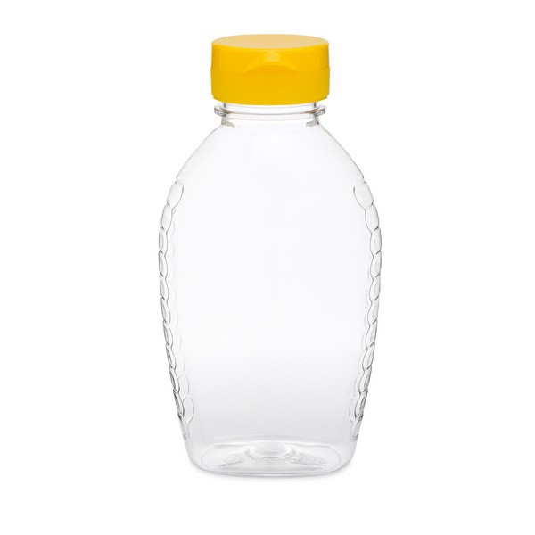 Our PET plastic bee hive honey bottles have the traditional style of the Queenline classic bottle. Features ribbed edging on both narrow sides and wider bottom to prevent tipping. The crystal-clear PET material has the look of glass but resists breakage during shipping, on the shelf or at home. Not for carbonation. Please test with your specific product to ensure proper performance. Maximum Fill Temperature: 140 degrees F. Includes a yellow low-profile flip-top PP plastic dispensing cap with foam liner.