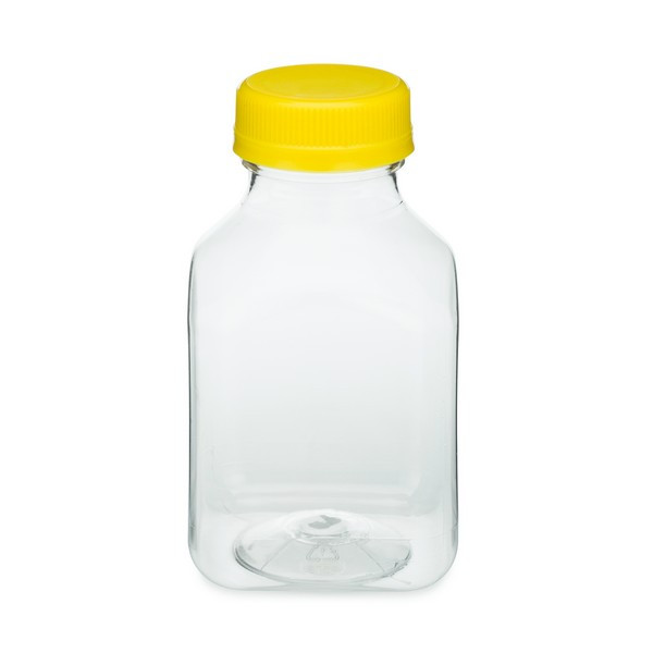 Our PET contoured square bottles are made of crystal clear PET plastic. Some popular uses of this product include juice, water or other non-carbonated beverages. Suitable for High Pressure Processing (HPP). Test with your specific product to ensure proper performance. Bottles include HDPE tamper-evident caps.